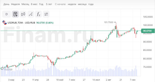 Рубль на валютной секции Московской биржи утром слабеет. Он теряет к доллару 0,37%, опускаясь до 96,58.